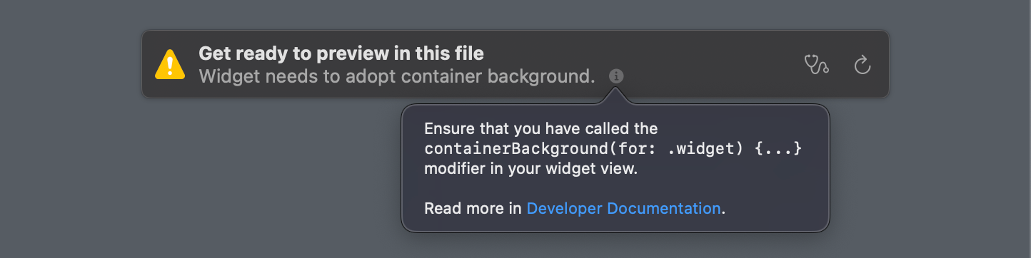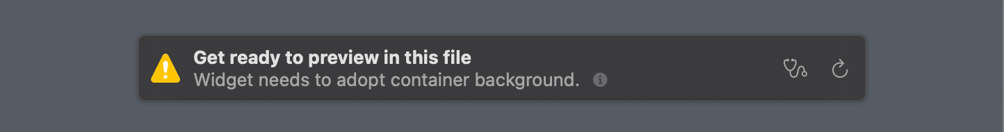 All of my widgets were showing this strange stop sign icon with an exclamation point and some some truncated text: "WIDGET_BAC..." When I went back to Xcode to preview my widgets, I saw this warning: "Widget needs to adopt container background."